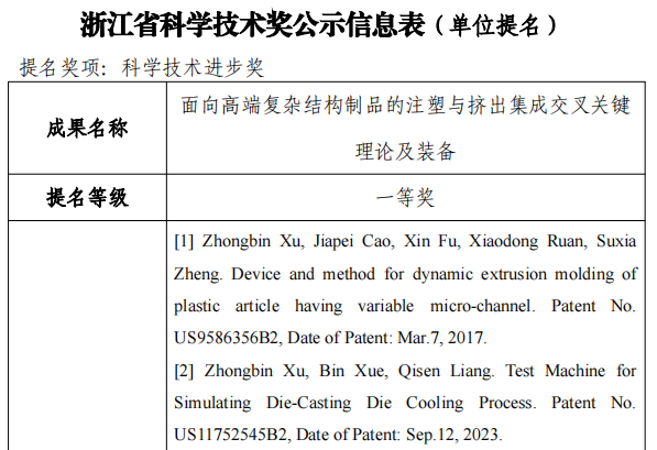 根據(jù)《浙江省科學技術廳關于開展2023年度浙江省科學技術獎提名工作的通知》有關要求,現(xiàn)將德清申達機器制造有限公司作為完成人工作單位的成果(成果名稱:面向高端復雜結(jié)構制品的注塑與擠出集成交叉關鍵理論及裝備)相關內(nèi)容予以公示。公示時間:2024年8月9日-2024年8月15日。在公示期內(nèi)如有異議,可以來電或來信方式反映。凡匿名異議、超出期限異議的,不予受理。聯(lián)系人:金萍萍電話:13706535940電子郵箱:Jinpp@injectionmachine.com